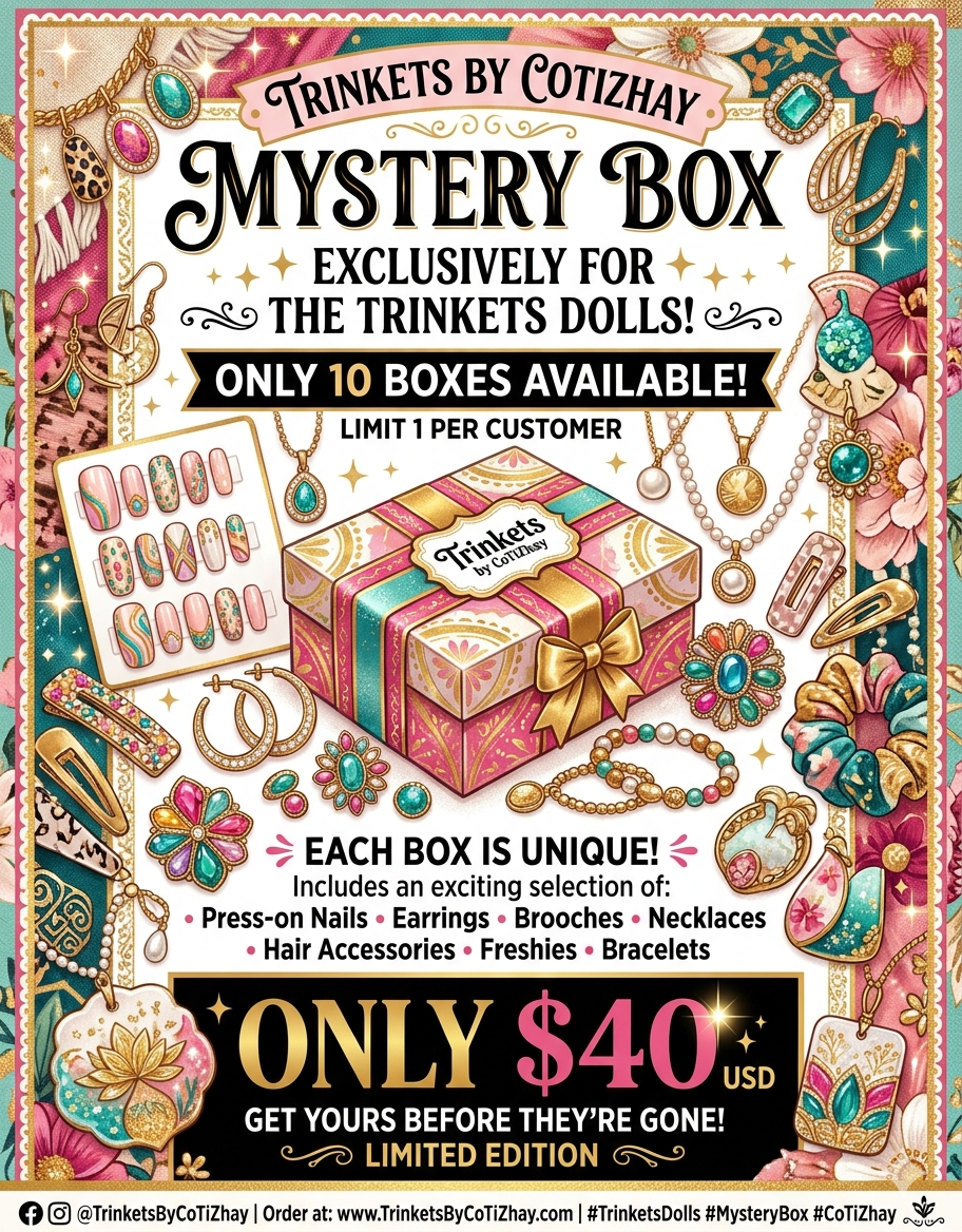 Treat yourself to the ultimate surprise with our Trinkets by CoTiZhay Mystery Bundle! Curated exclusively for our "Trinkets Dolls," this limited-edition box is packed with a hand-picked selection of our most loved accessories.